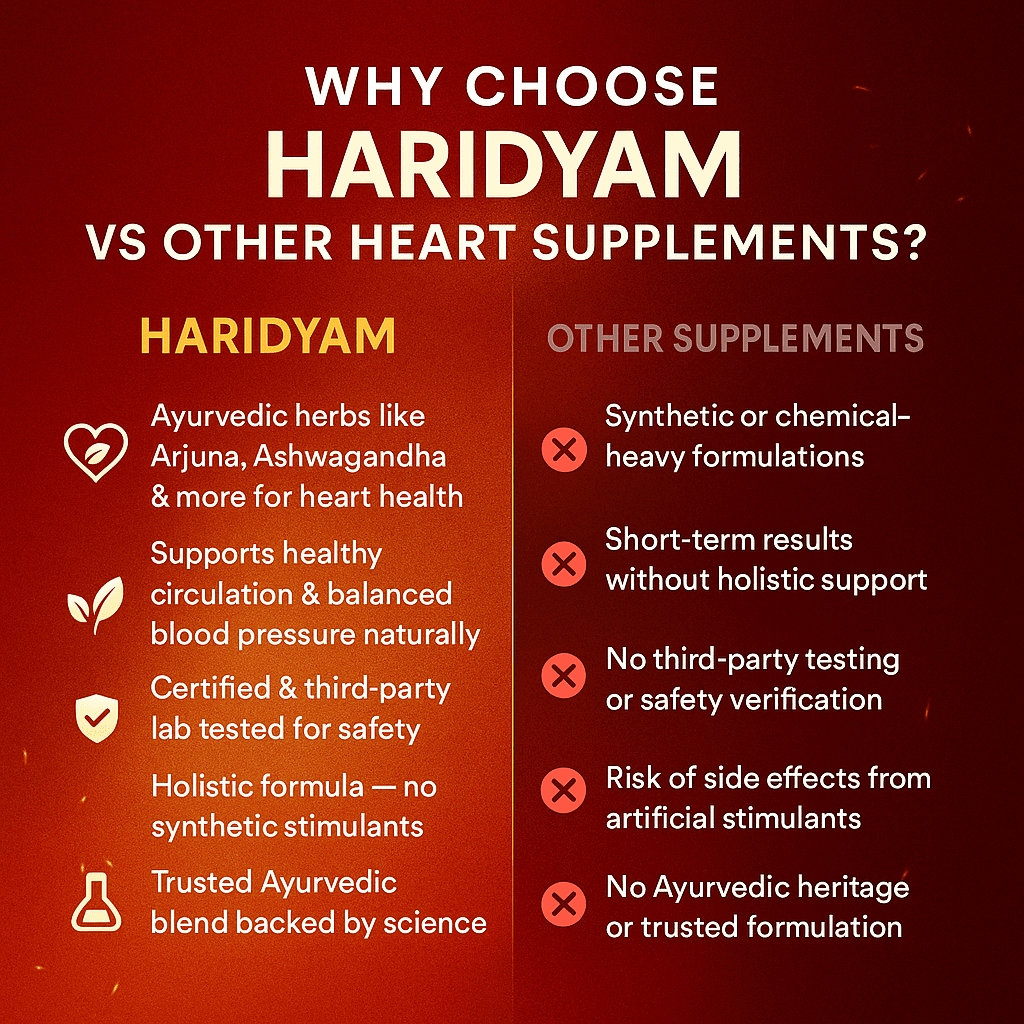 Choose HARIDYAM for trusted Ayurvedic heart care — safe, holistic, and scientifically backed. Say no to synthetic shortcuts, and yes to natural strength for your heart.